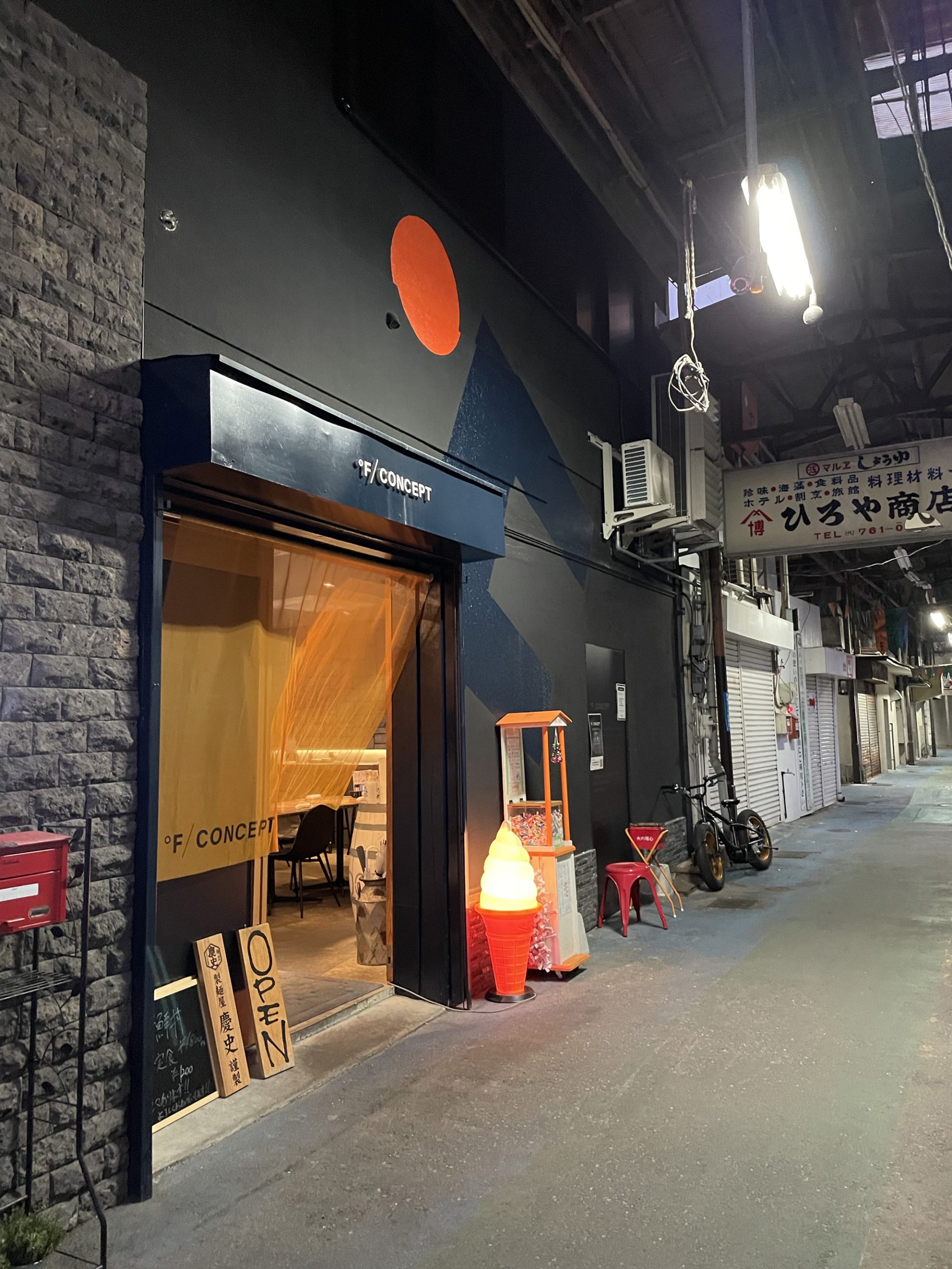 宿泊先から徒歩10分程度で到着。中洲近くの柳橋連合市場内にある「°F/CONCEPT(エフコンセプト)」。柳橋連合市場は戦前の昭和から徐々に鮮魚店を中心にお店が集まり、戦後は平成に柳橋連合市場共同組合を設立された昭和ムード漂うアーケードエリア。
