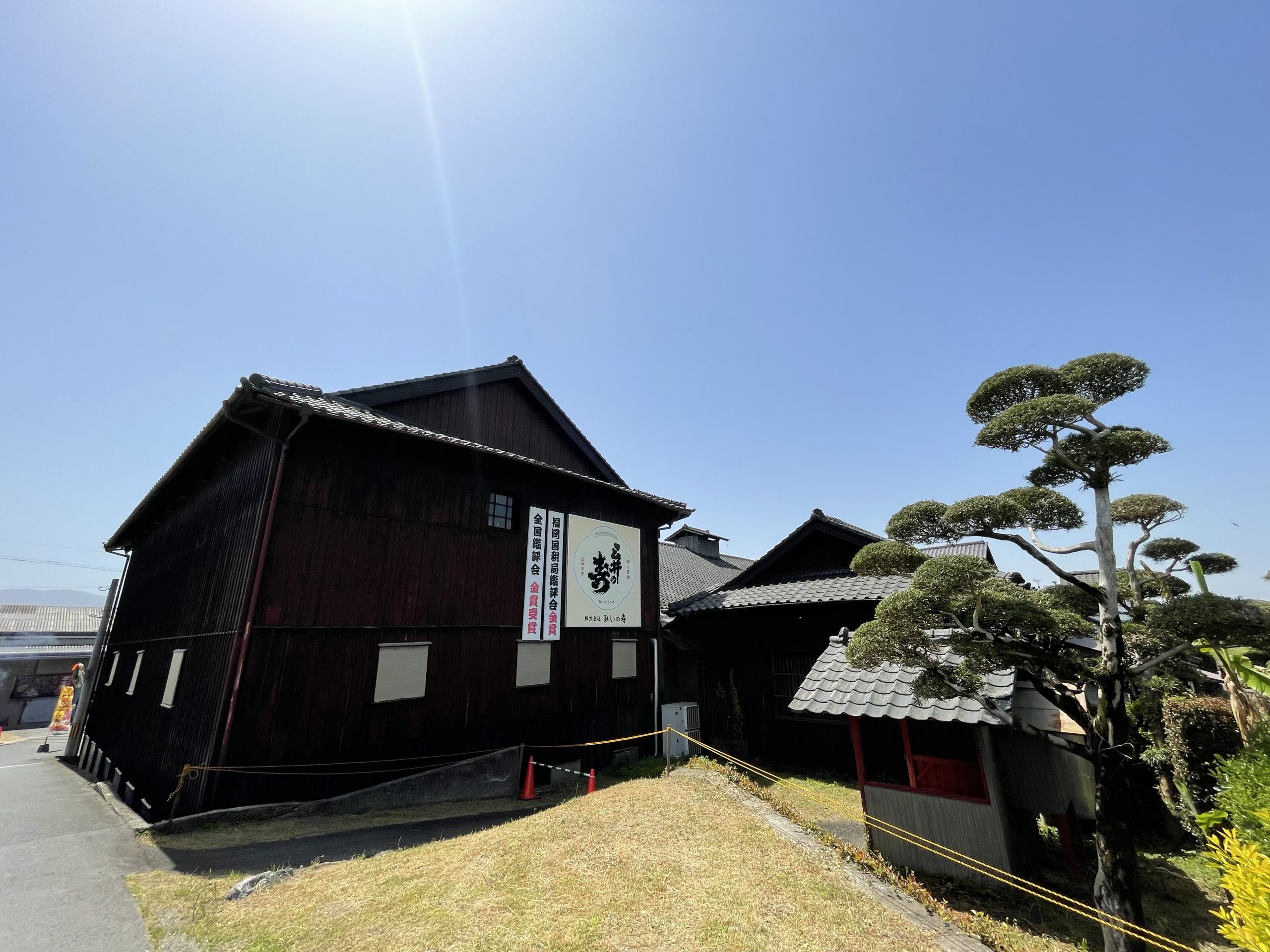 晴天の空と緑の田んぼが揺れる長めの良い橋を渡り、見えてきたのは「研醸」、そのすぐ左に「みいの寿」。