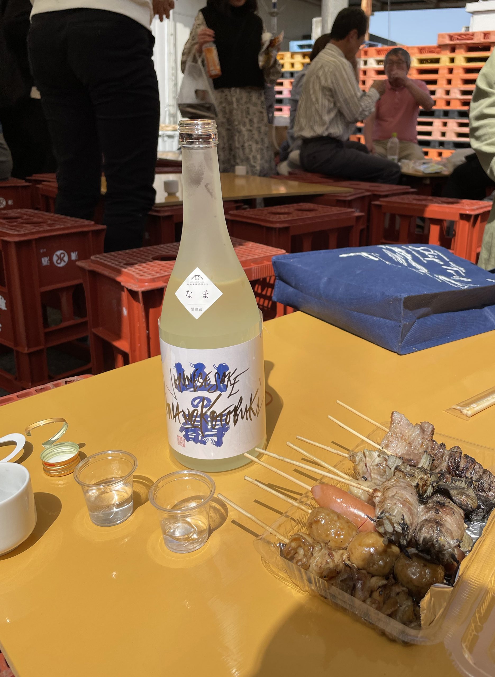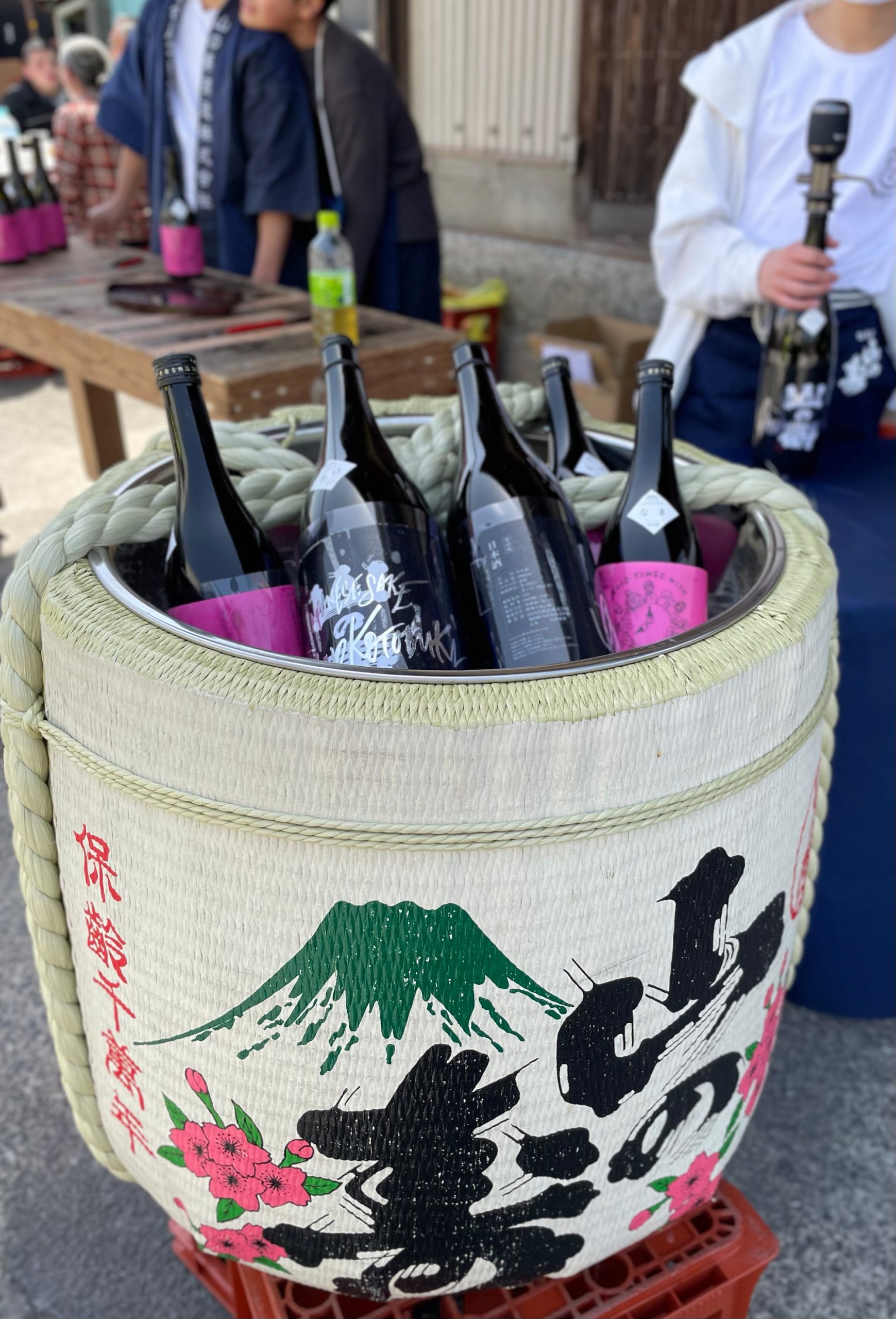 樽の写真を撮ろうとすると、その横になぜかラガーマン数人が楽しげにファンサービスをしていた。その背後にP箱の椅子でゆったりと飲み交わす人たちが見えたので、自分たちも早速飲むことに。