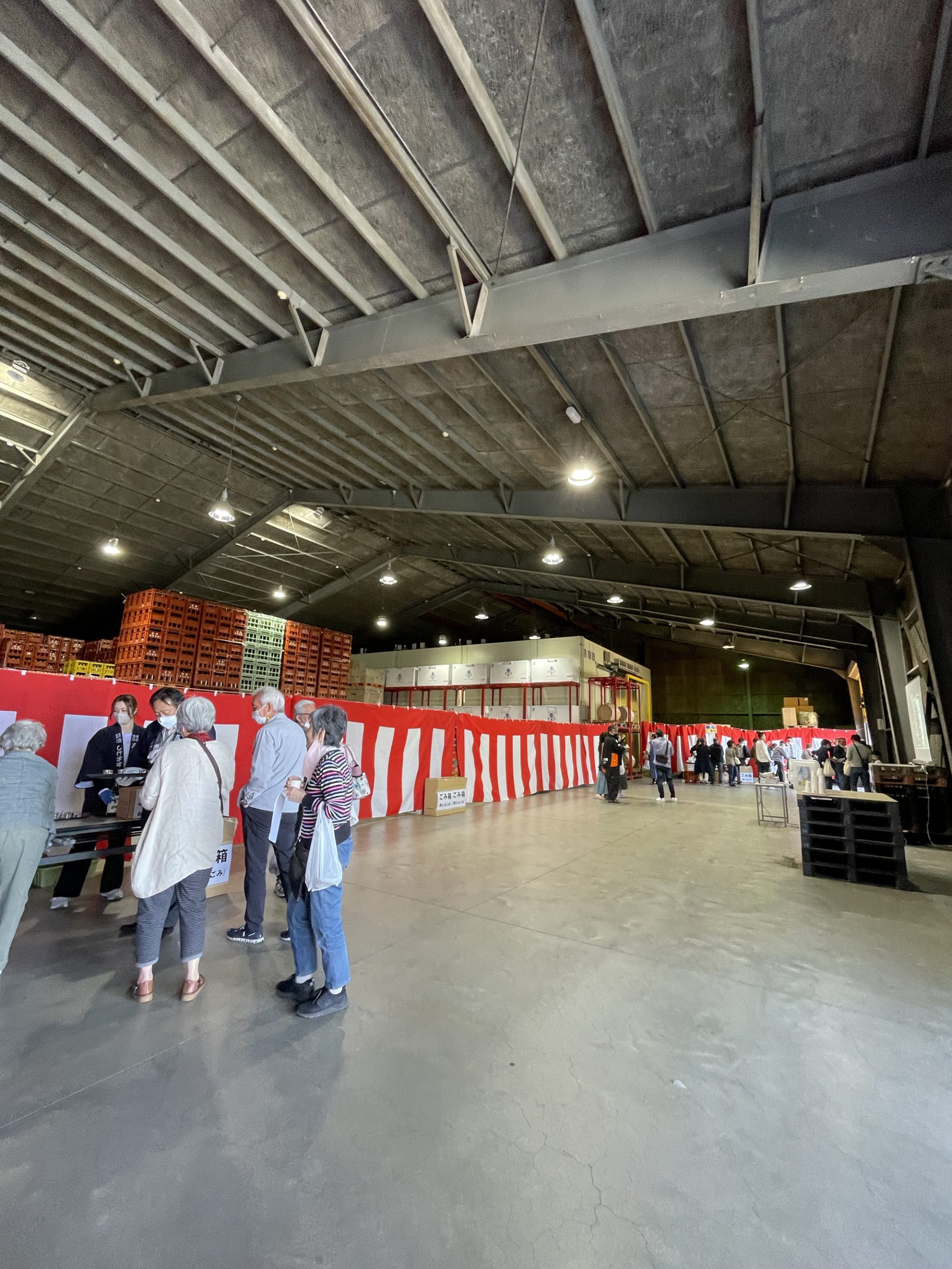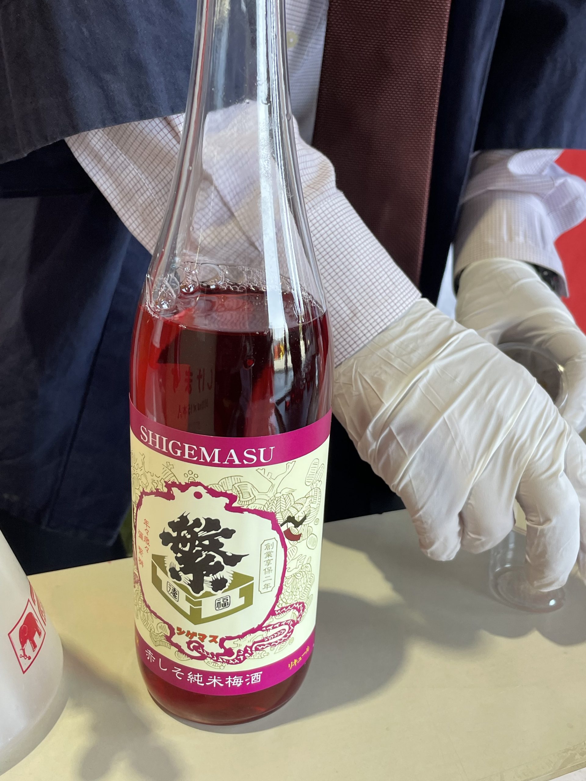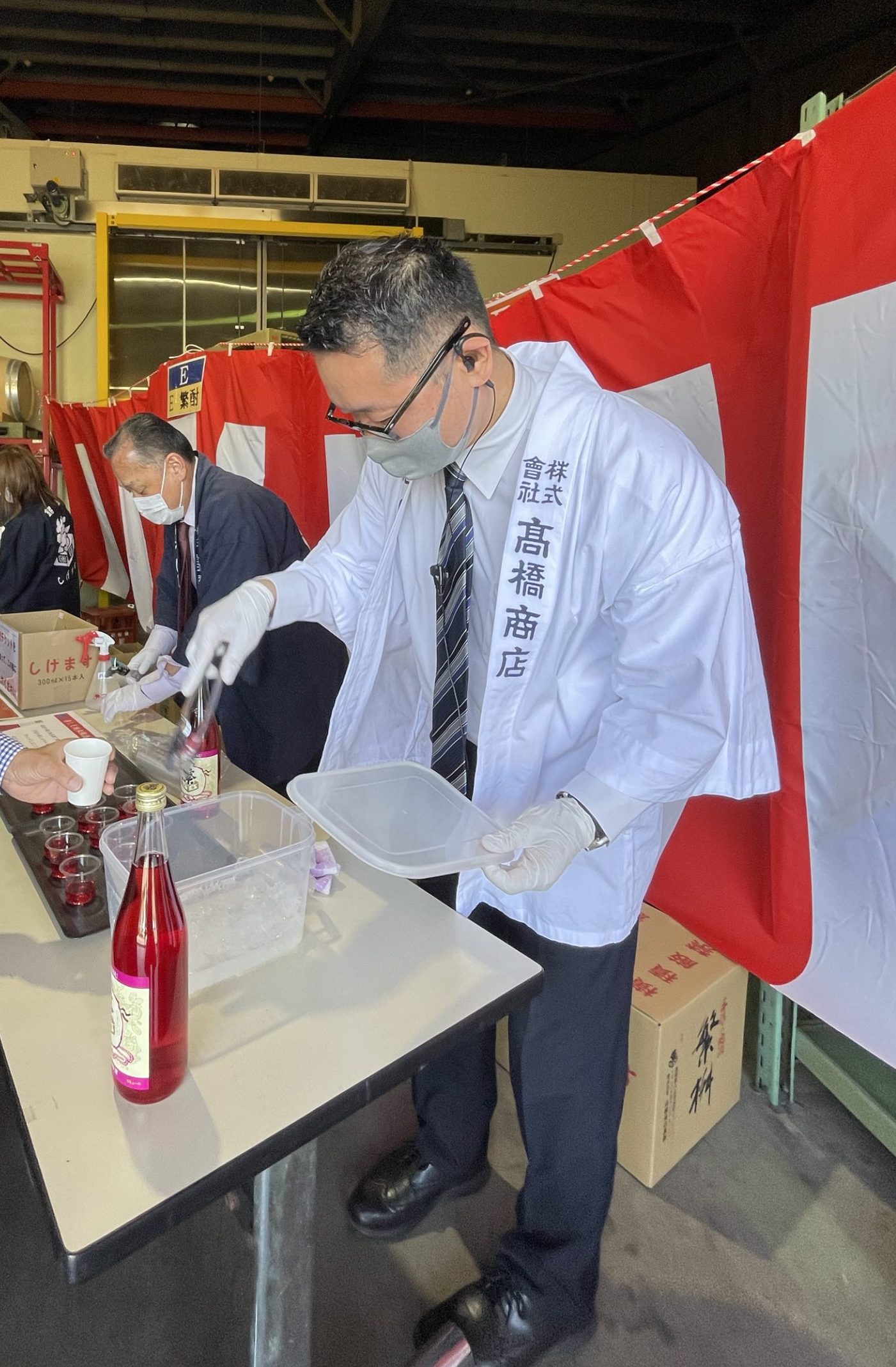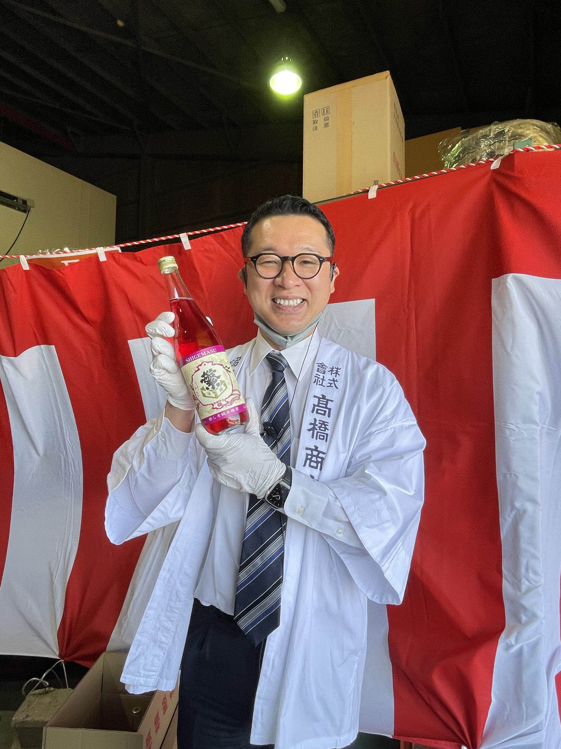 走った後の酒は美味い!と全部いただいて、醸造蔵を出て出荷倉庫へ向かう。高い天井と紅白の幕にテンションが上がりつつも時間が無いので、遠くに見えた高橋社長までダッシュし、ご挨拶をして写真を1枚頂きました。この赤紫色のお酒「赤しそ純米梅酒」はロックで提供されており、酸味と甘さのバランスが優しくて美味。綺麗な色なのでデザート酒に良さそう。