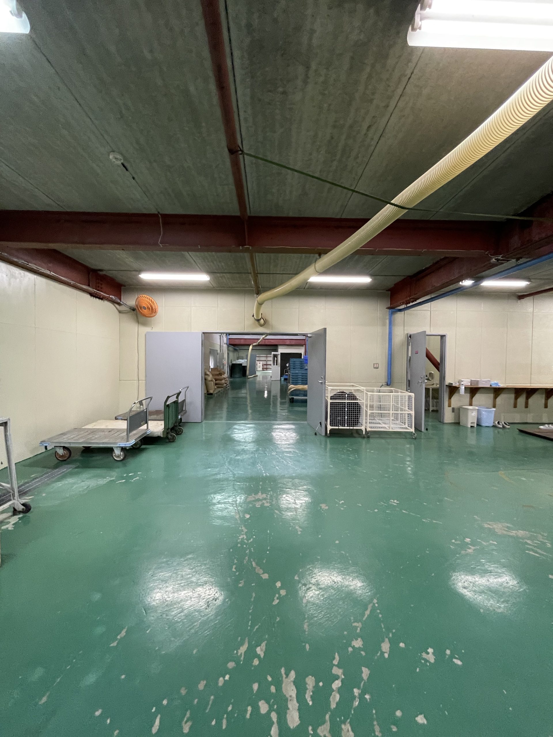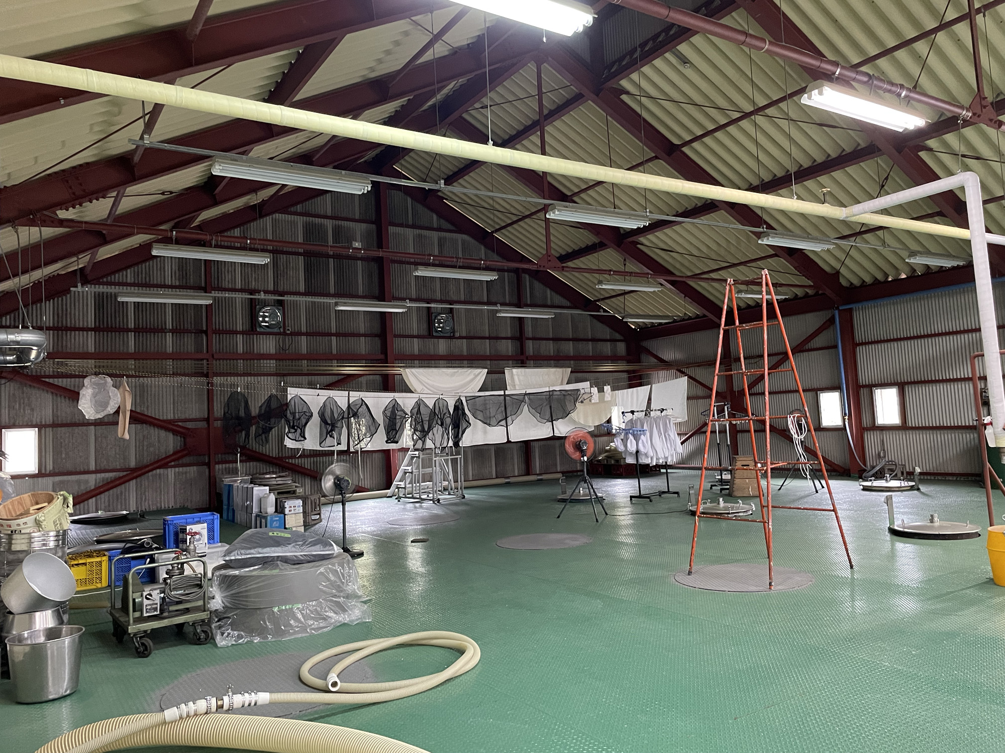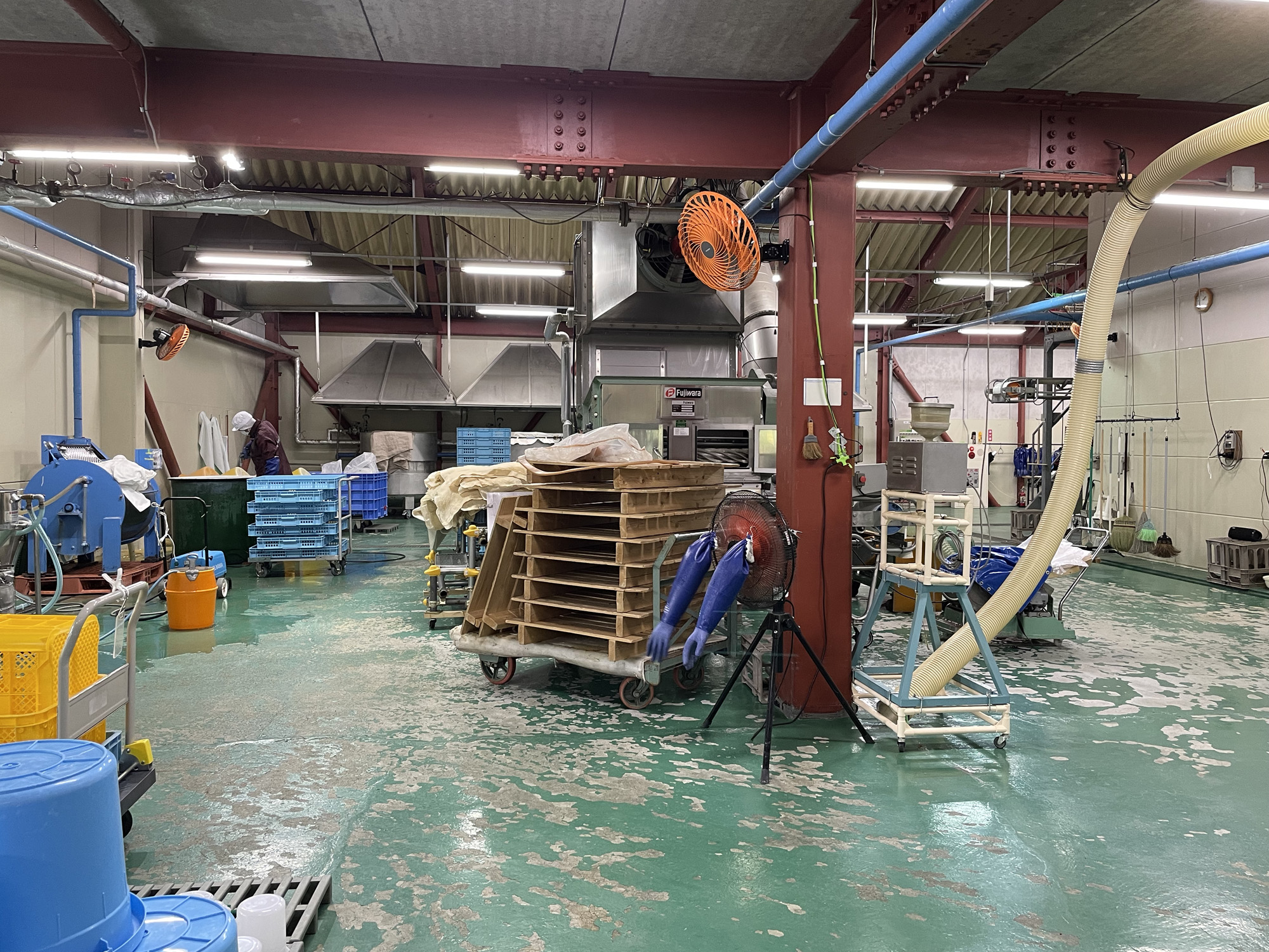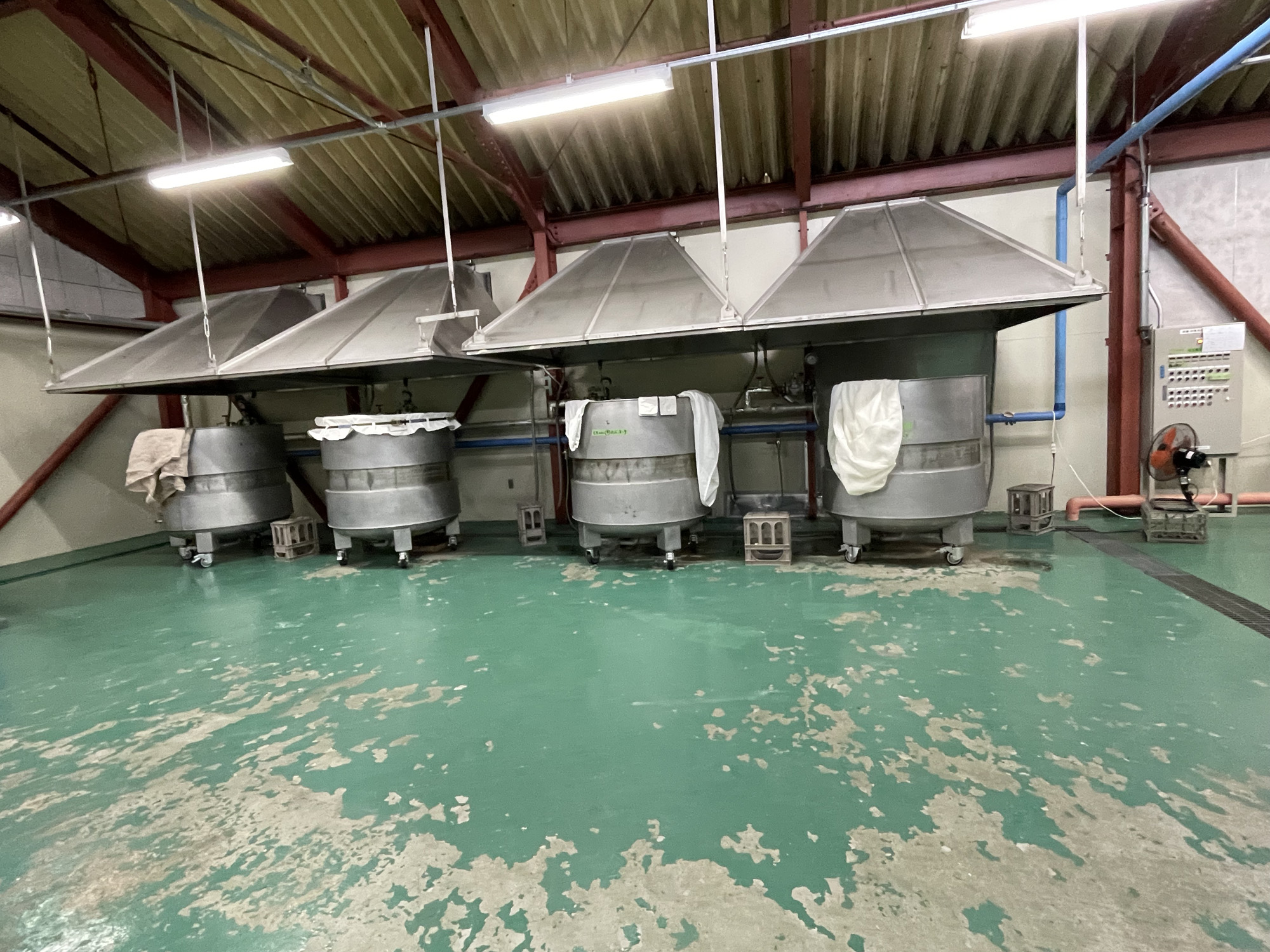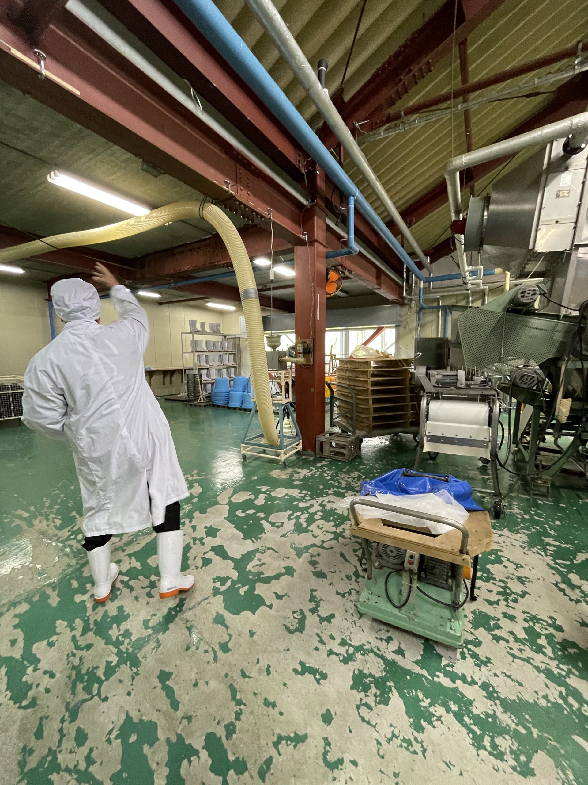 J-popが流れる作業場で白い長靴、不織布の帽子、ビニールの上着を着用。中には片付けや掃除中のスタッフ1名。軽く会釈し、扇風機に煽られて膨らむビニール手袋を眺めつつ、ここから蔵見学スタート。以降文中の「 」は松田さんの解説です。