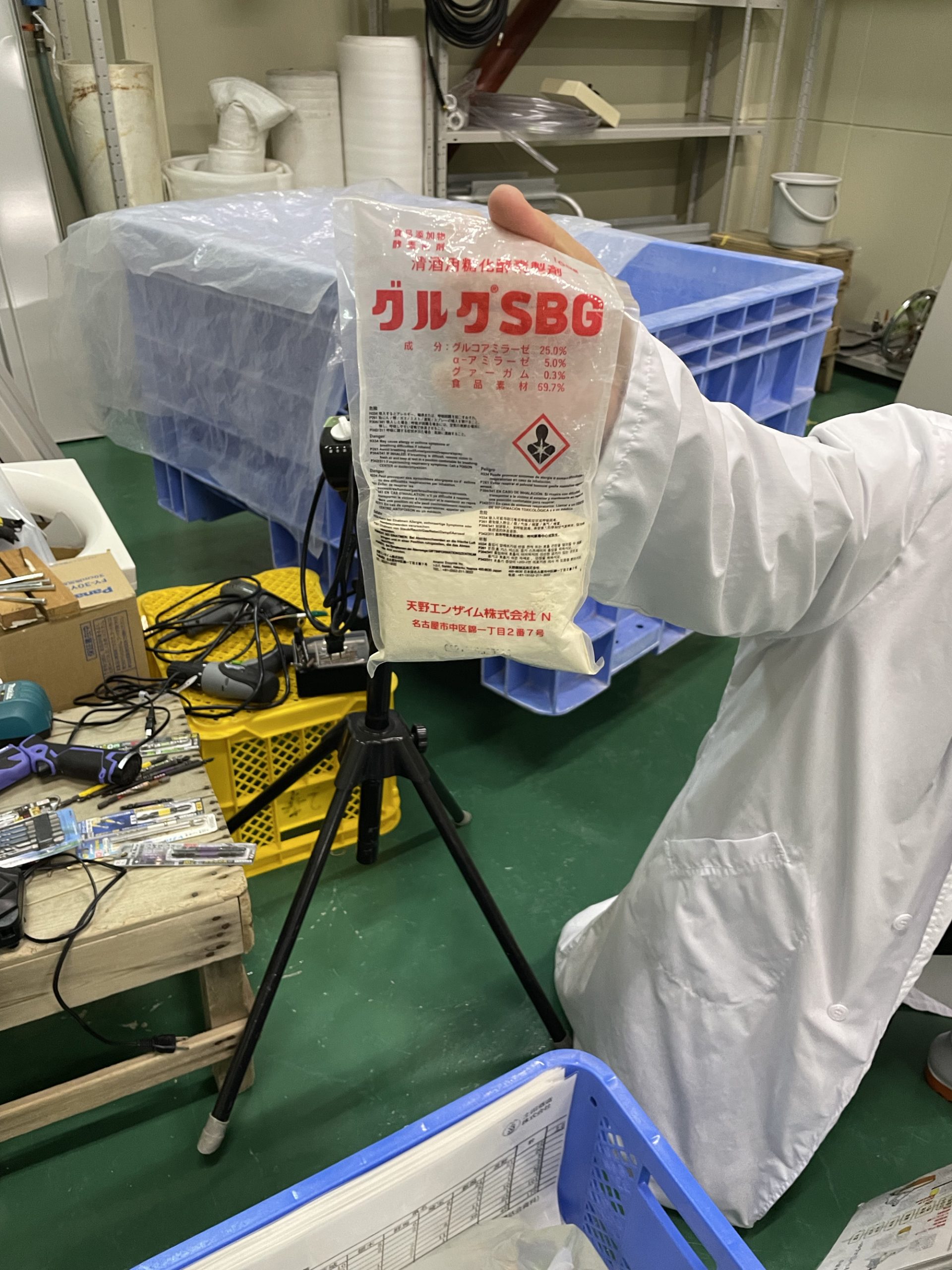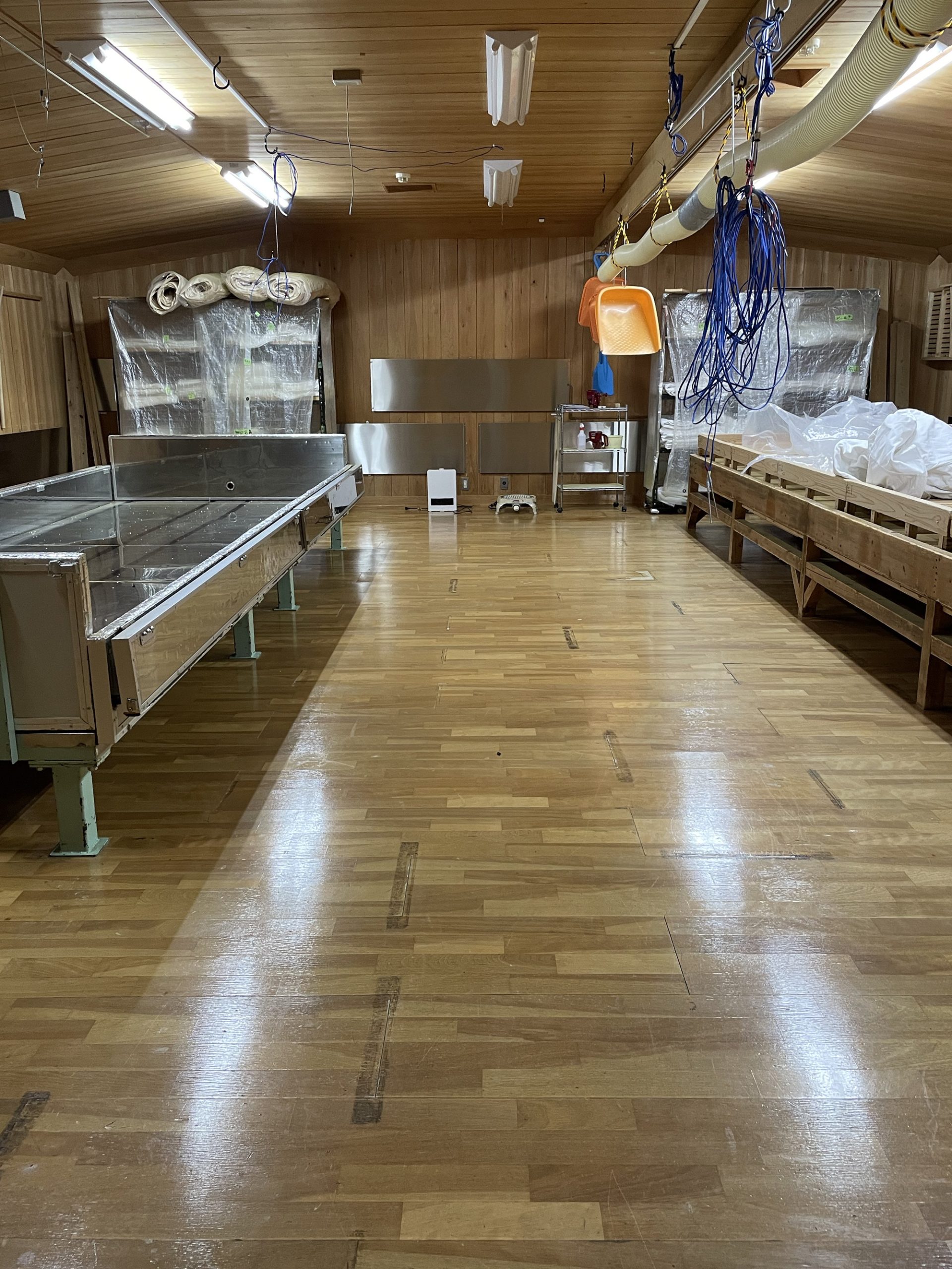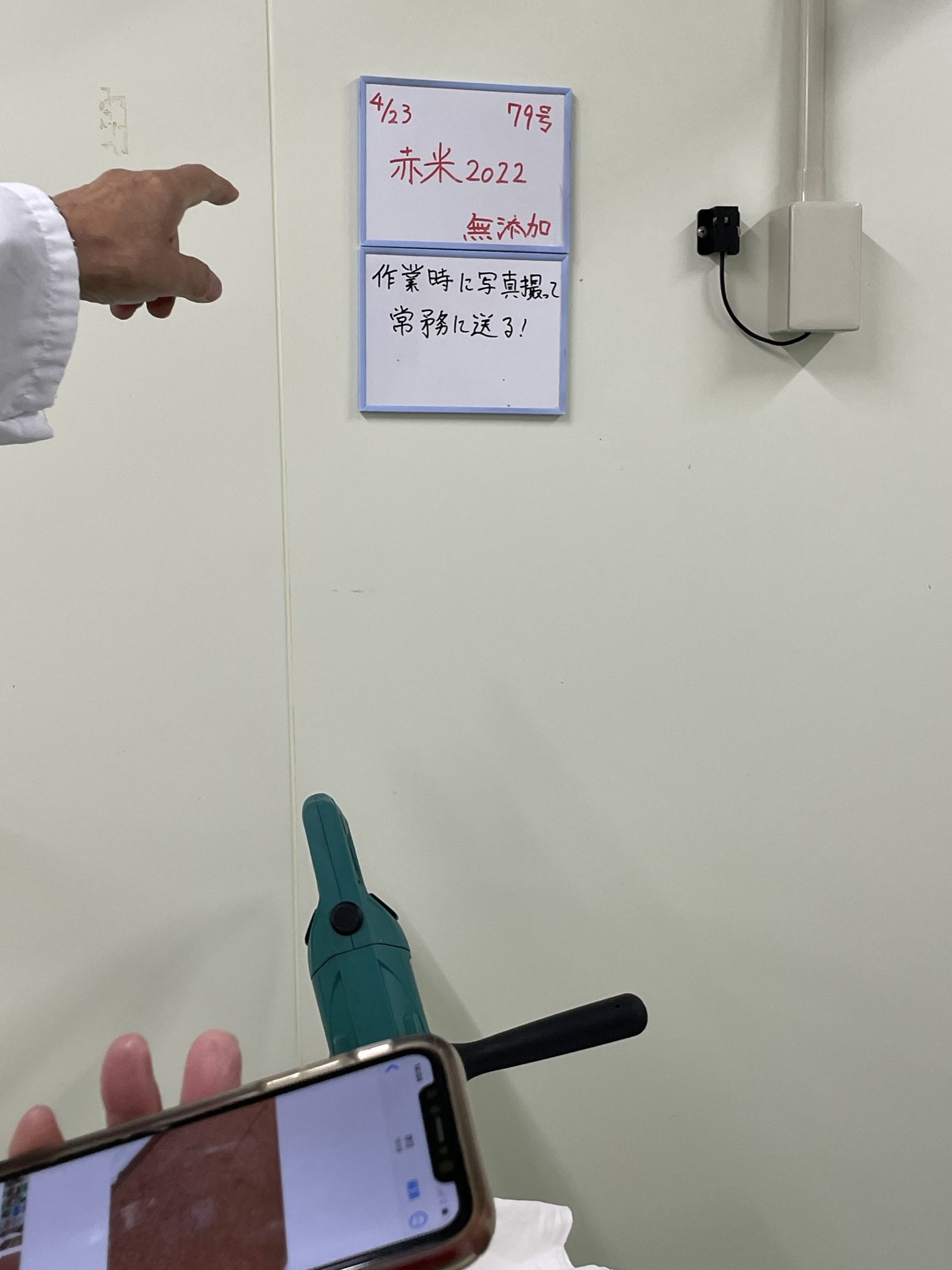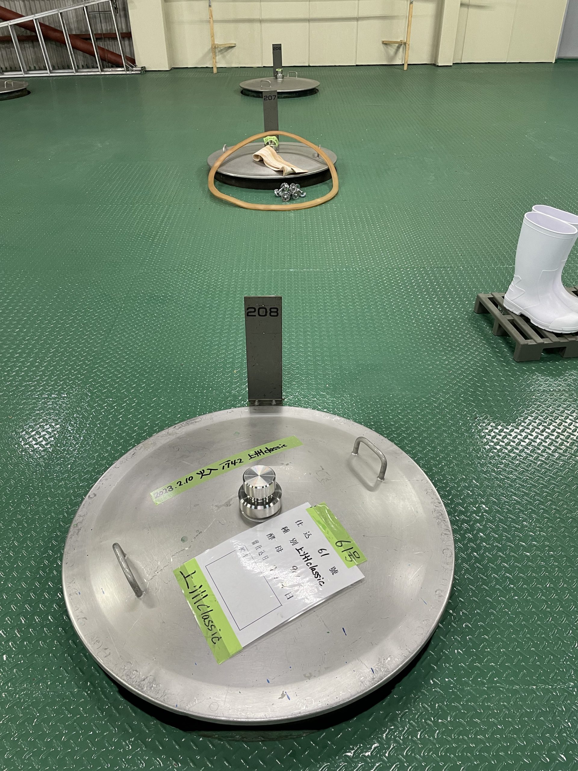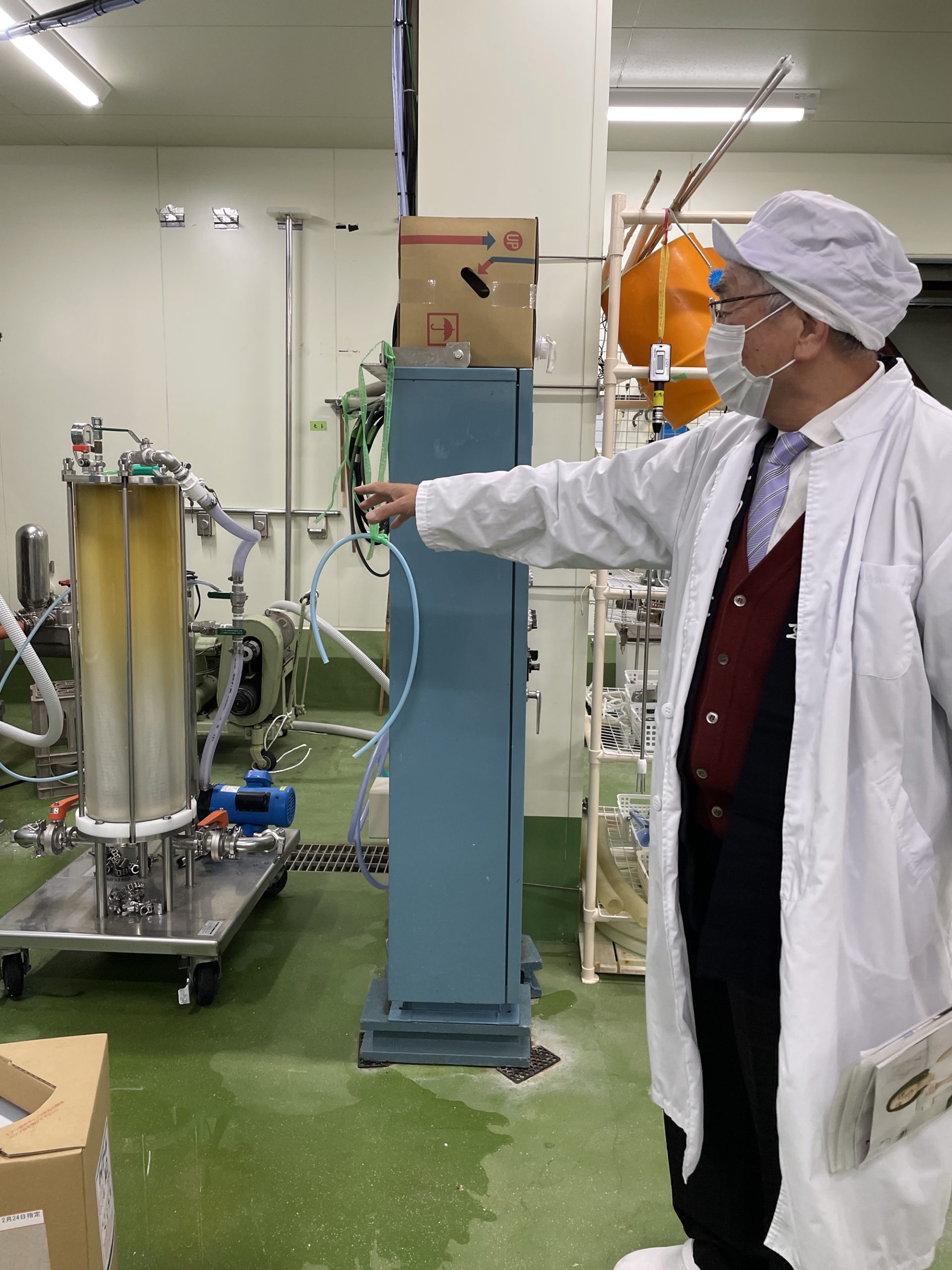 J-popが流れる作業場で白い長靴、不織布の帽子、ビニールの上着を着用。中には片付けや掃除中のスタッフ1名。軽く会釈し、扇風機に煽られて膨らむビニール手袋を眺めつつ、ここから蔵見学スタート。以降文中の「 」は松田さんの解説です。