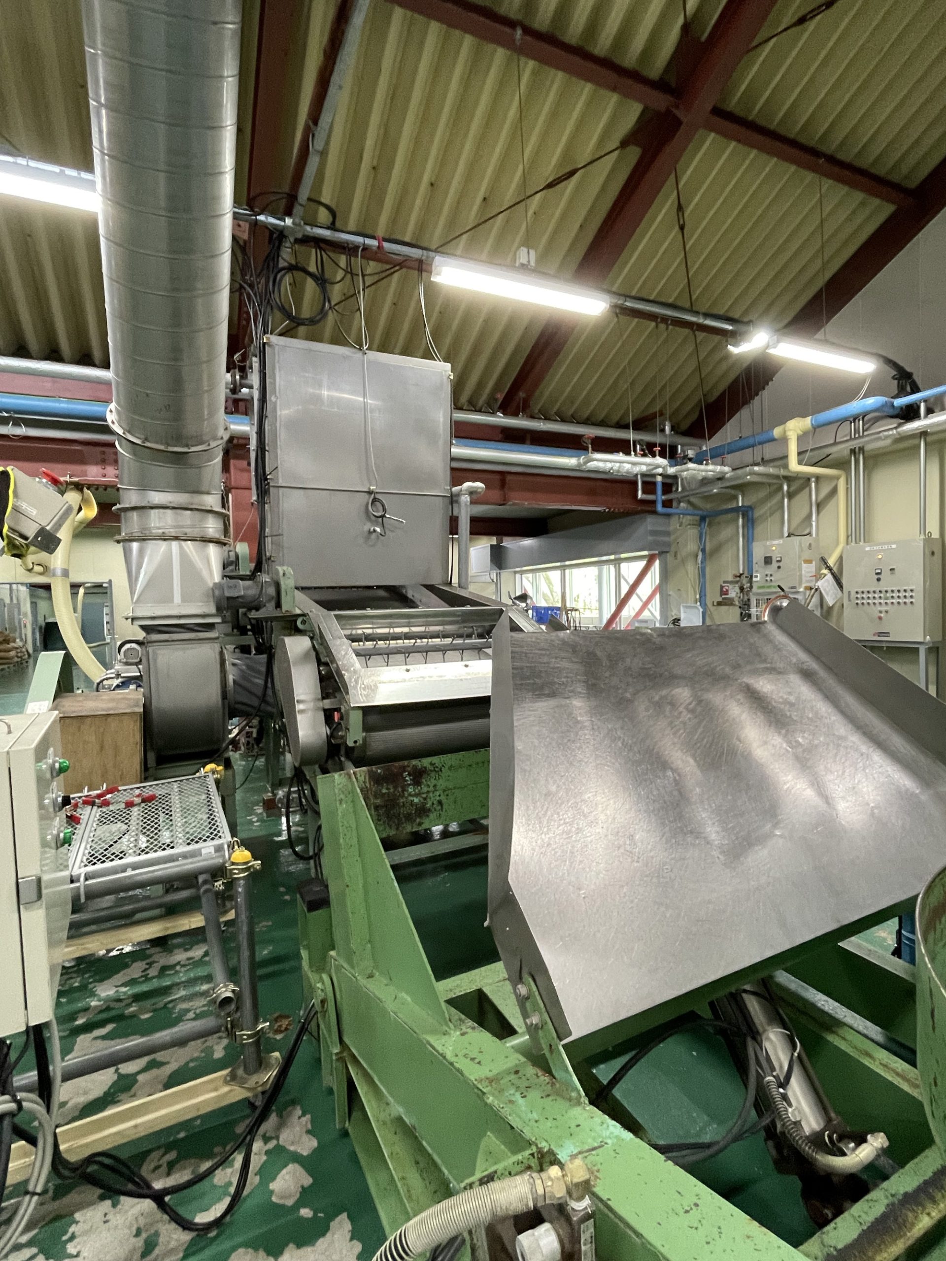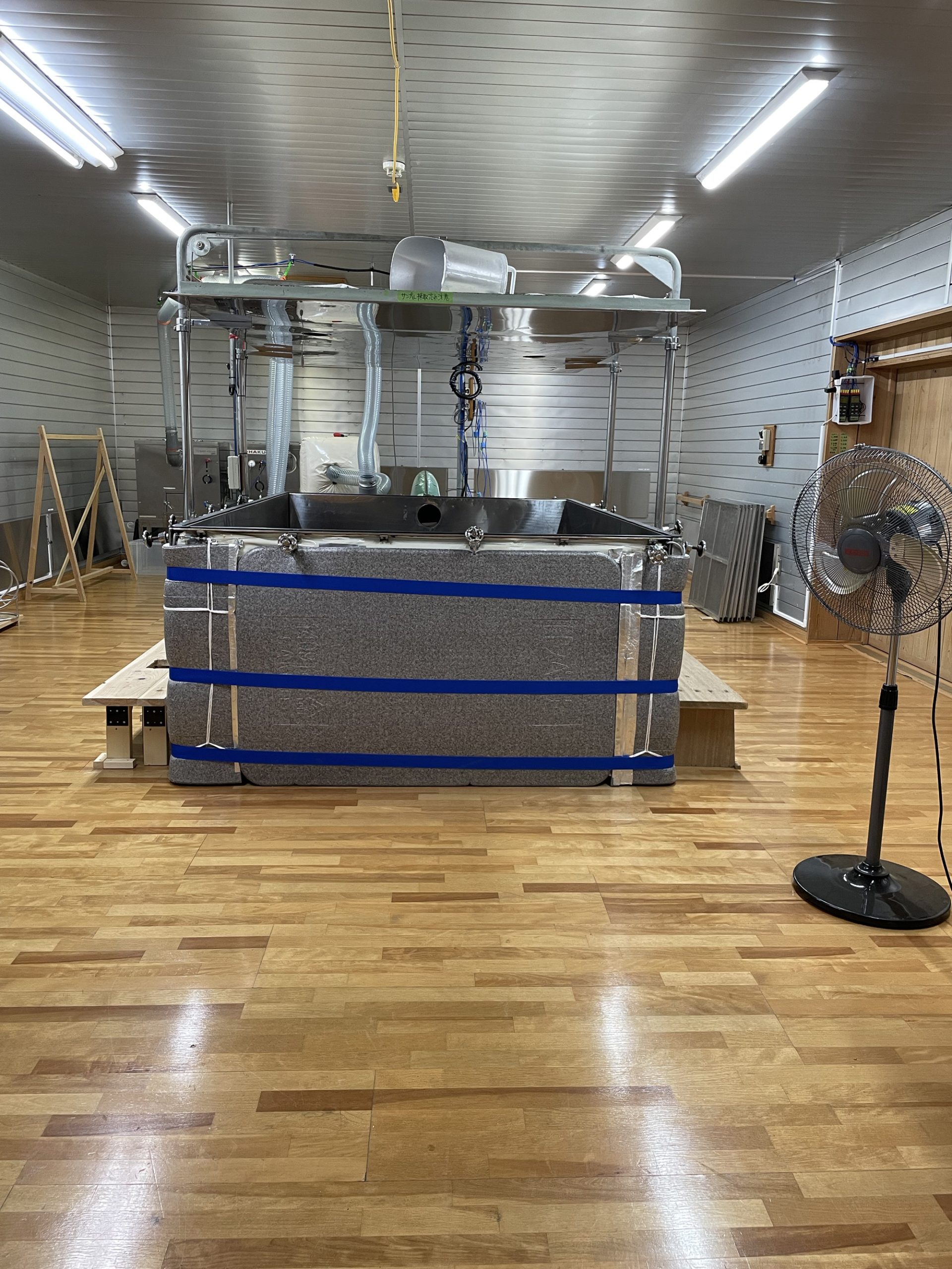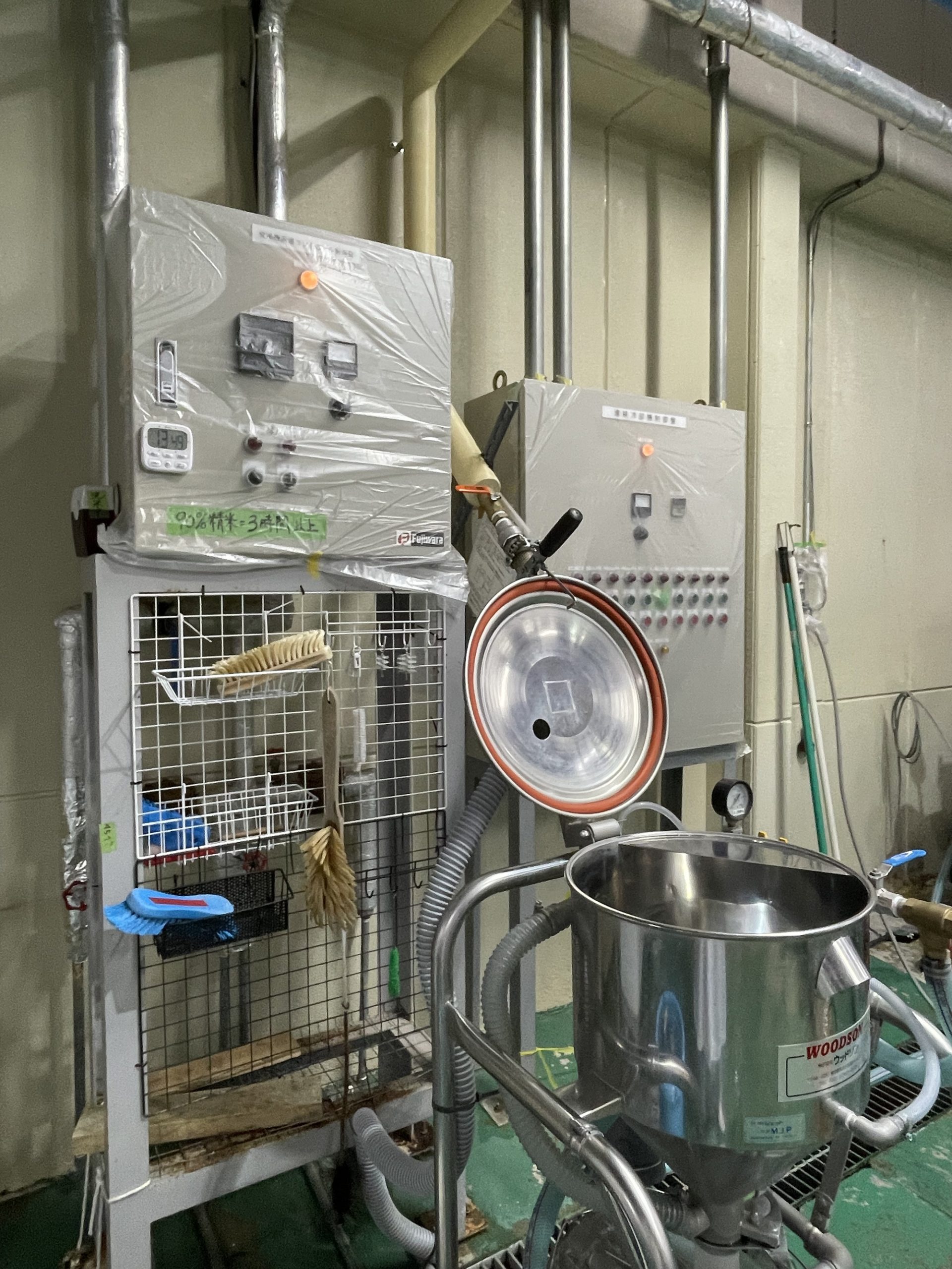 土田酒造では可動式の小さなタンク数個に分けてボイラーで蒸すとのこと。出来上がったアツアツの蒸米は放冷機で冷まされ麹室へ。