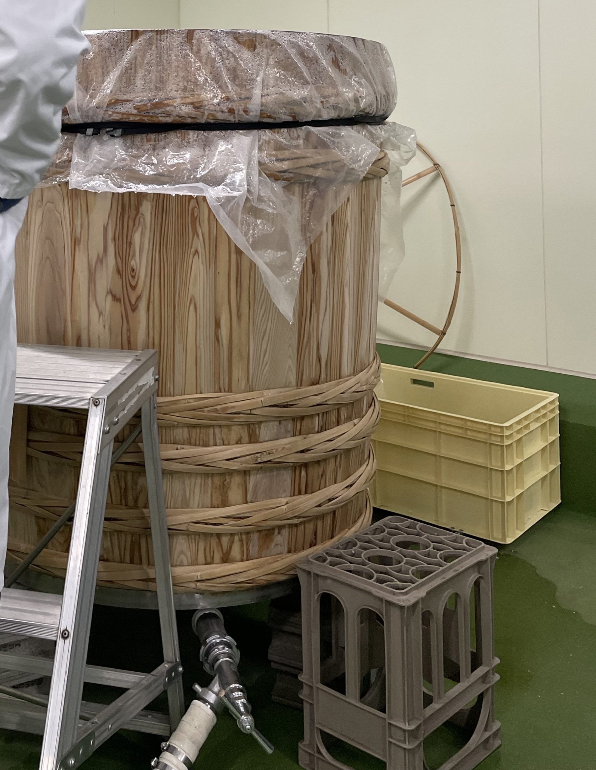 三段仕込みをし、醪を完成させる部屋。木桶の仕込みタンクが1つ。