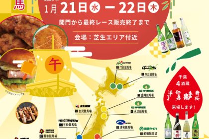 船橋ケイバ第10回開催期間中の1月21日(水)ブルーバードカップ、1月22日(木)報知グランプリカップの2つの重賞レースに合わせて、千葉県と地方競馬場のある地域の日本酒と料理が楽しめるイベント「全国地方競馬 ウマい!新春ご当地グルメカップ」が開催。